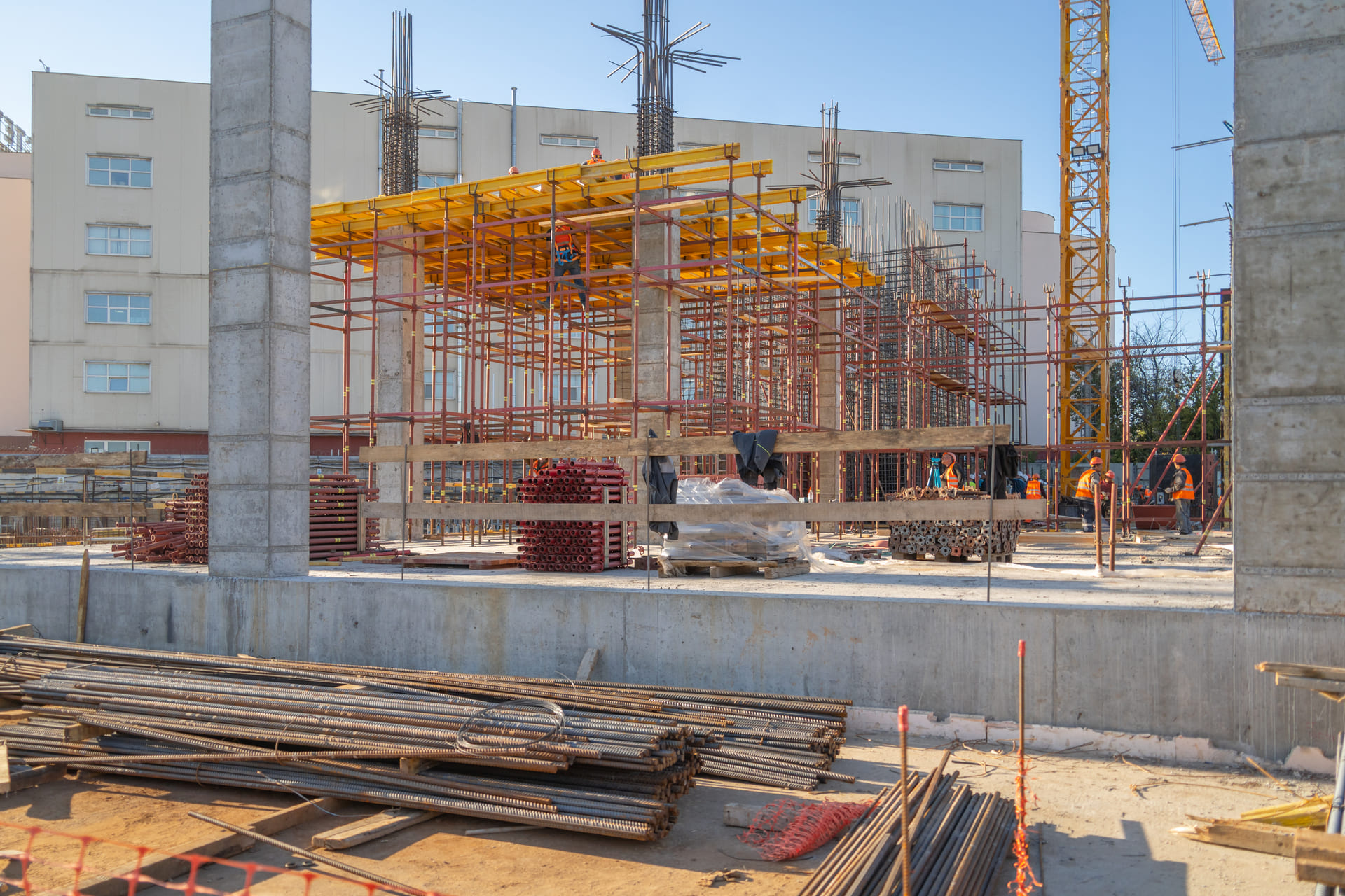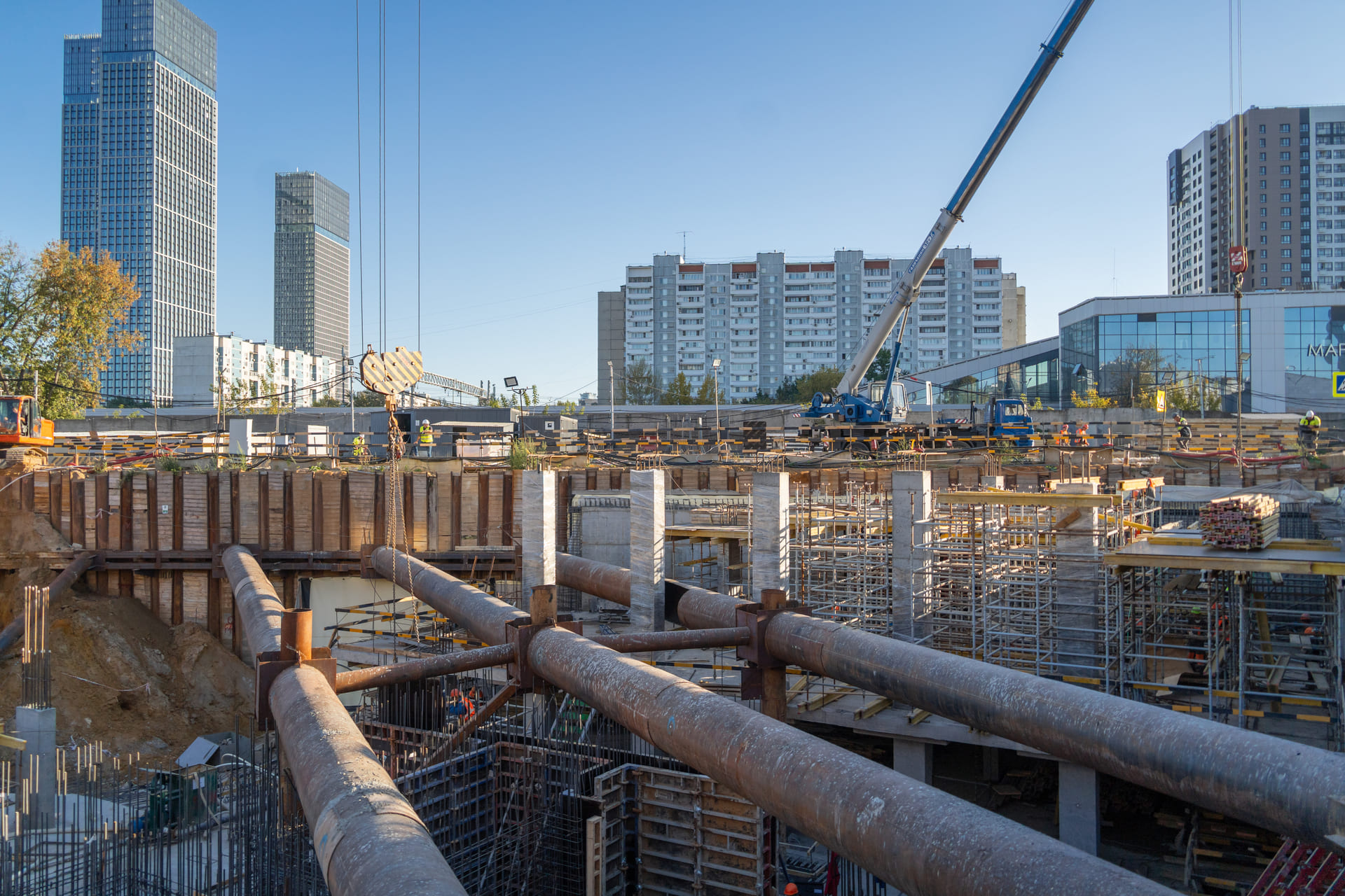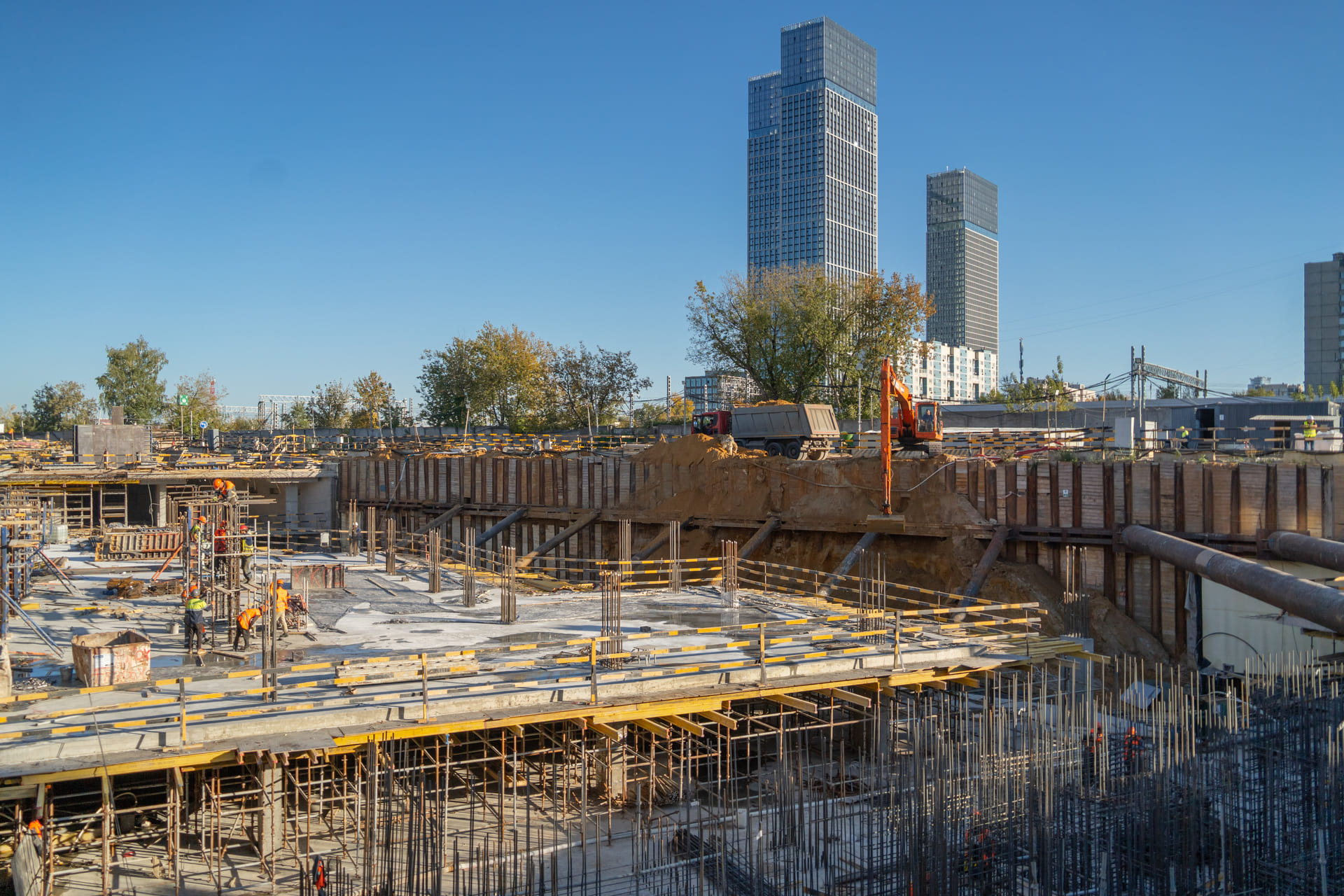 Завершены работы по разработке грунта котлована. Производится возведение монолитных железобетонных конструкций подземной части здания.